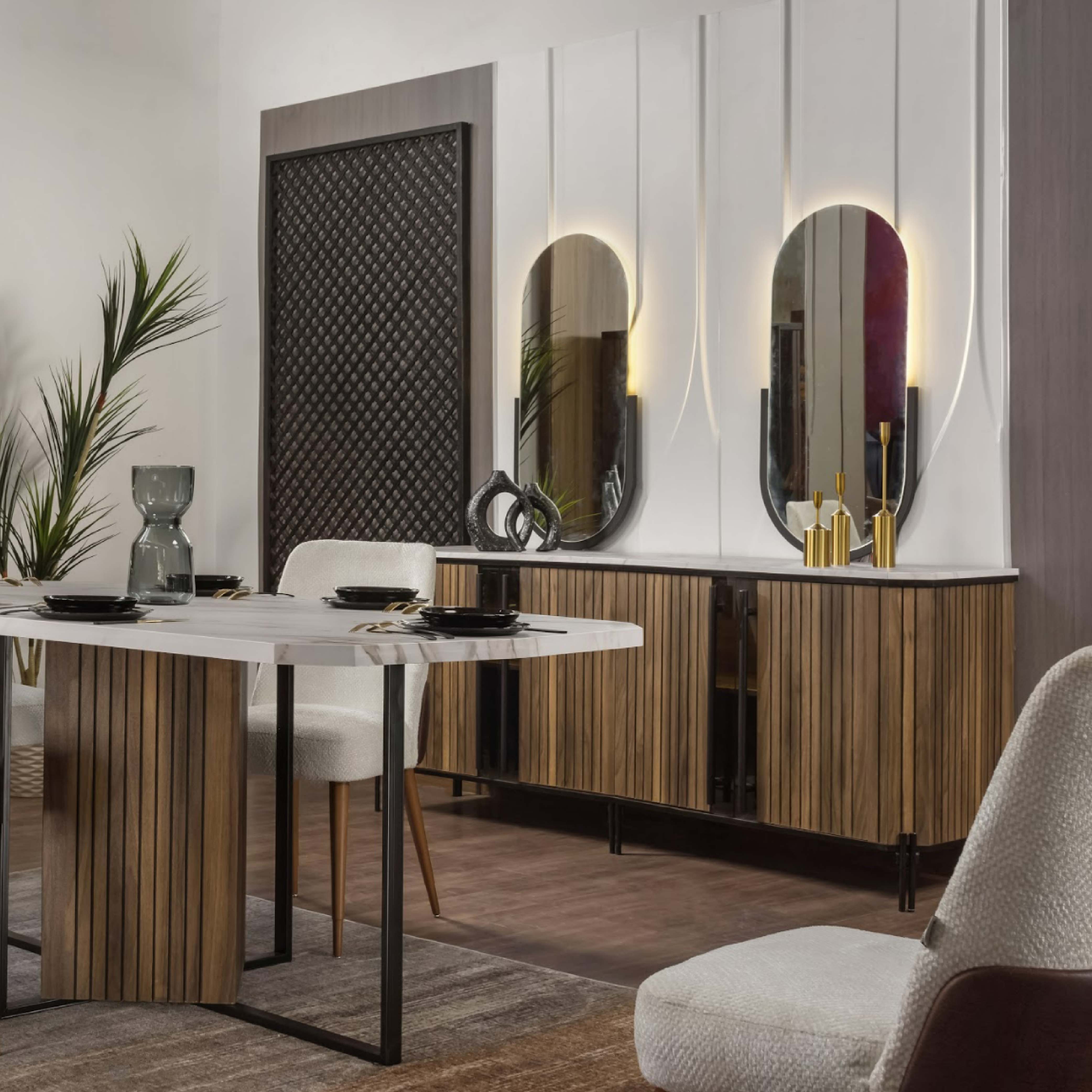 سفرة مكونة من ترابيزة + 6 كراسي + نيش + بوفيه مسطحات الغرفة خشب ام دي اف كراسي السفرة خشب زان احمر